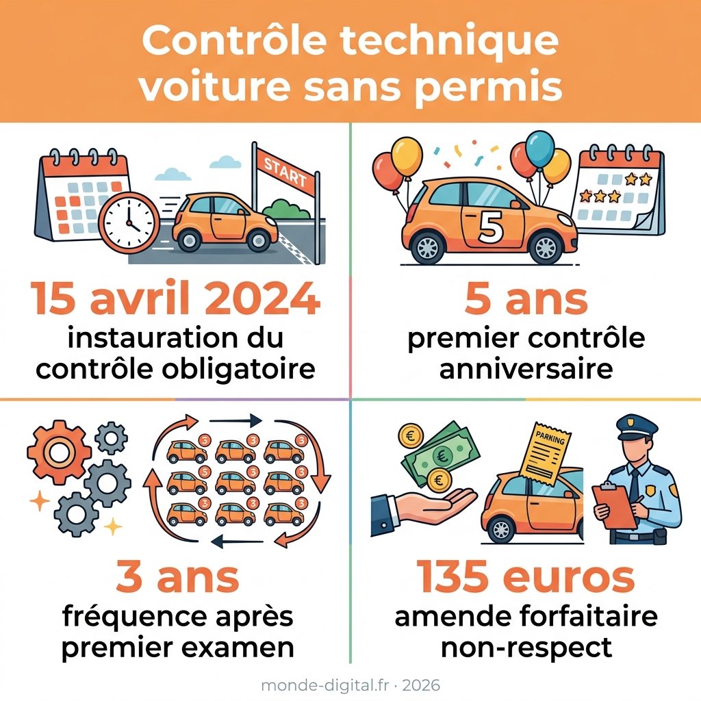 Depuis le 15 avril 2024, les propriétaires de voitures sans permis doivent respecter de nouvelles obligations de contrôle technique. Cette réforme impose un calendrier strict d’inspections périodiques, avec des sanctions financières en cas de non-respect. Maîtriser ces échéances légales devient indispensable pour circuler en toute légalité, éviter les amendes et préserver la valeur de revente de votre véhicule. Ce guide détaille le contrôle technique voiture sans permis : calendrier selon l’année d’immatriculation, points de contrôle, coûts et obligations lors de la vente.